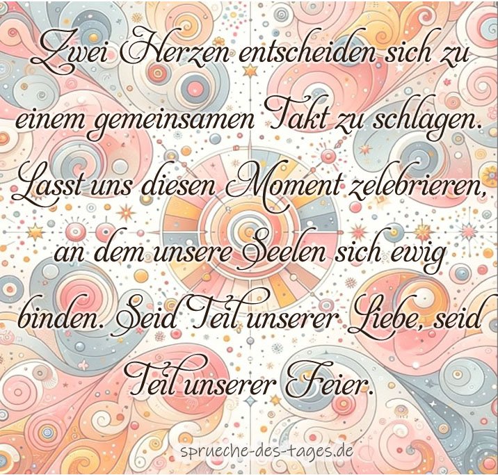- „Zwei Herzen entscheiden sich zu einem gemeinsamen Takt zu schlagen. Lasst uns diesen Moment zelebrieren, an dem unsere Seelen sich ewig binden. Seid Teil unserer Liebe, seid Teil unserer Feier.“